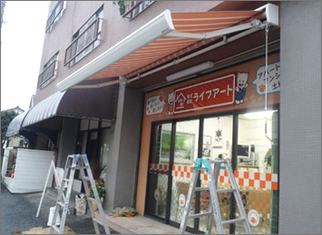 店頭の日よけと雨対策に、丈夫で強いサンシェードを取付けました。